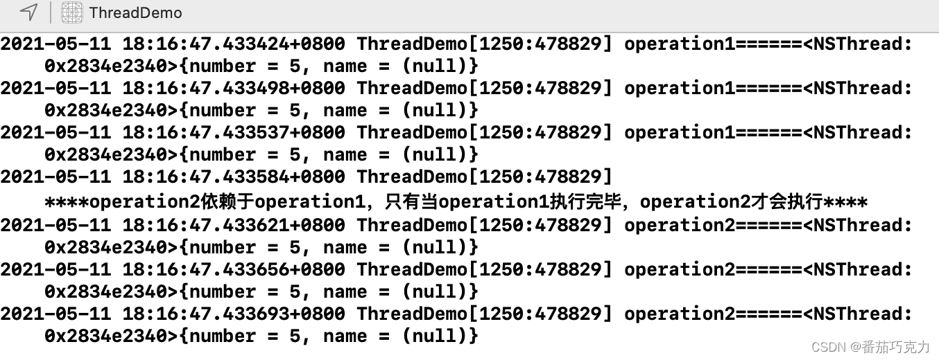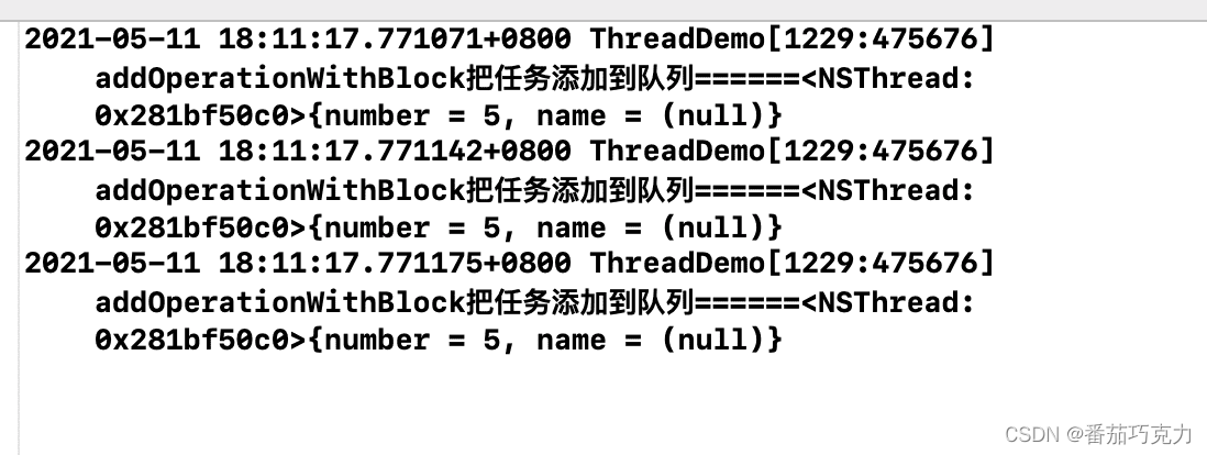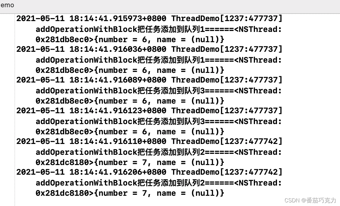 - (void)testOperationQueue {//创建队列,默认并发NSOperationQueue *queue = [[NSOperationQueue alloc] init];//创建操作,NSInvocationOperationNSInvocationOperation *op = [[NSInvocationOperation alloc] initWithTarget:self selector:@selector(queueOperationAddOperation) object:nil];// 创建操作,NSBlockOperationNSBlockOperation *bp = [NSBlockOperation blockOperationWithBlock:^{for (int i = 0; i < 3; i++) {NSLog(@"NSBlockOperation======%@", [NSThread currentThread]);}}];[queue addOperation:op];[queue addOperation:bp];}- (void)queueOperationAddOperation {NSLog(@"invocationOperation====%@", [NSThread currentThread]);