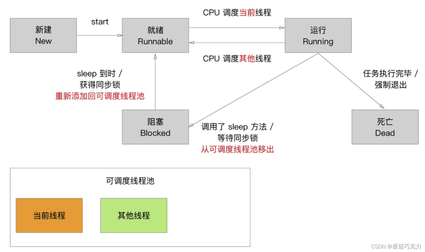 - 运行:CPU负责调用可调用线程池中的线程执行。线程执行完成之前,状态可能会在就绪和运行之间来回切换。就绪和运行的状态是由CPU负责,程序员不能干涉。