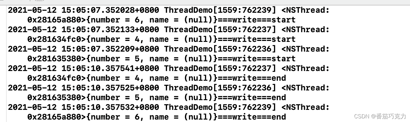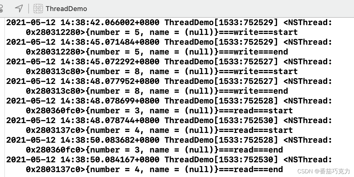 dispatch_queue_t queue = dispatch_queue_create("concurrent_queue", DISPATCH_QUEUE_CONCURRENT);for (int i = 0; i < 3; i ++) {dispatch_async(queue, ^{sleep(1);NSLog(@"%@===read",[NSThread currentThread]);});}for (int i = 0; i < 3; i ++) {dispatch_barrier_async(queue, ^{sleep(1);NSLog(@"%@===write",[NSThread currentThread]);});}for (int i = 0; i < 3; i ++) {dispatch_async(queue, ^{sleep(1);NSLog(@"%@===read",[NSThread currentThread]);});}