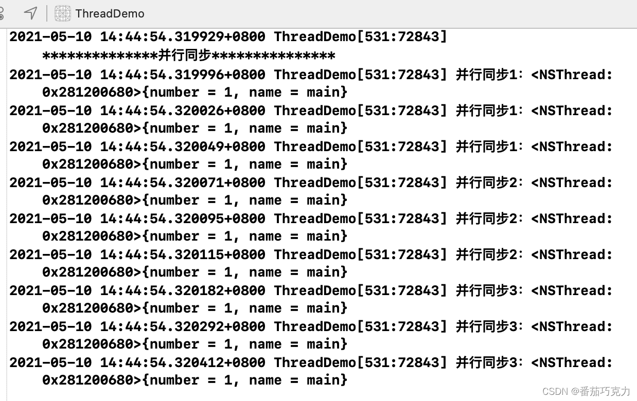 - (void)syncConcurrent {NSLog(@"**************并行同步***************");dispatch_queue_t queue = dispatch_queue_create("test", DISPATCH_QUEUE_CONCURRENT);dispatch_sync(queue, ^{for (int i=0;i<3;i++) {NSLog(@"并行同步1:%@", [NSThread currentThread]);}});dispatch_sync(queue, ^{for (int i=0;i<3;i++) {NSLog(@"并行同步2:%@", [NSThread currentThread]);}});dispatch_sync(queue, ^{for (int i=0;i<3;i++) {NSLog(@"并行同步3:%@", [NSThread currentThread]);}});}