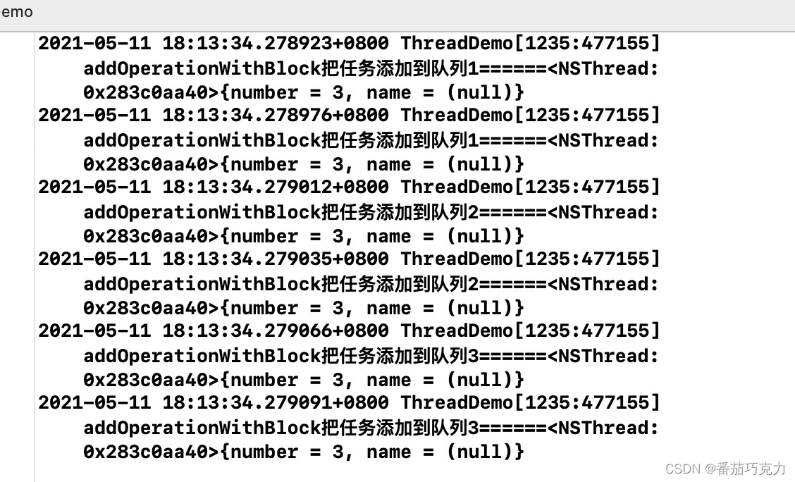 NSBlockOperation *bp = [NSBlockOperation blockOperationWithBlock:^{NSLog(@"NSBlockOperation主任务---%@",[NSThread currentThread]);}];[bp addExecutionBlock:^{NSLog(@"addExecutionBlock方法添加任务1========%@", [NSThread currentThread]);}];[bp addExecutionBlock:^{NSLog(@"addExecutionBlock方法添加任务2========%@", [NSThread currentThread]);}];[bp addExecutionBlock:^{NSLog(@"addExecutionBlock方法添加任务3========%@", [NSThread currentThread]);}];[bp start];