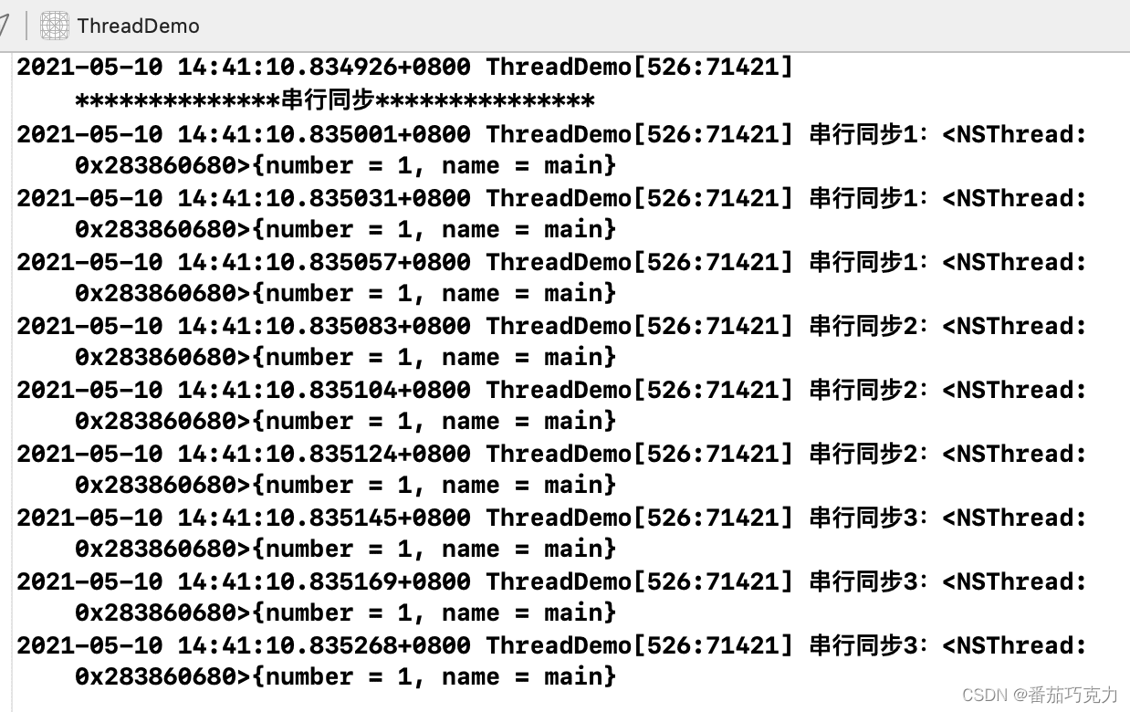 - (void)syncSerial {NSLog(@"**************串行同步***************");dispatch_queue_t queue = dispatch_queue_create("test", DISPATCH_QUEUE_SERIAL);dispatch_sync(queue, ^{for (int i=0;i<3;i++) {NSLog(@"串行同步1:%@", [NSThread currentThread]);}});dispatch_sync(queue, ^{for (int i=0;i<3;i++) {NSLog(@"串行同步2:%@", [NSThread currentThread]);}});dispatch_sync(queue, ^{for (int i=0;i<3;i++) {NSLog(@"串行同步3:%@", [NSThread currentThread]);}});