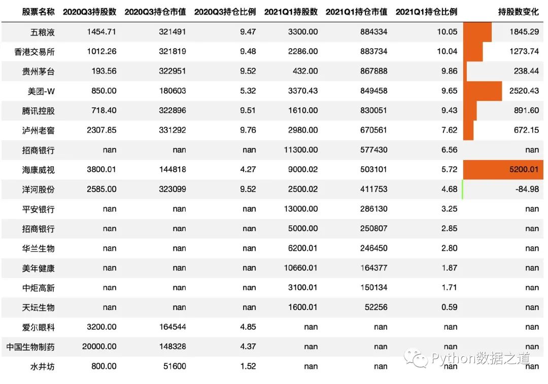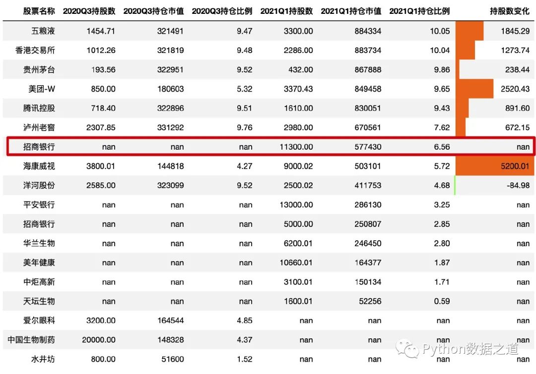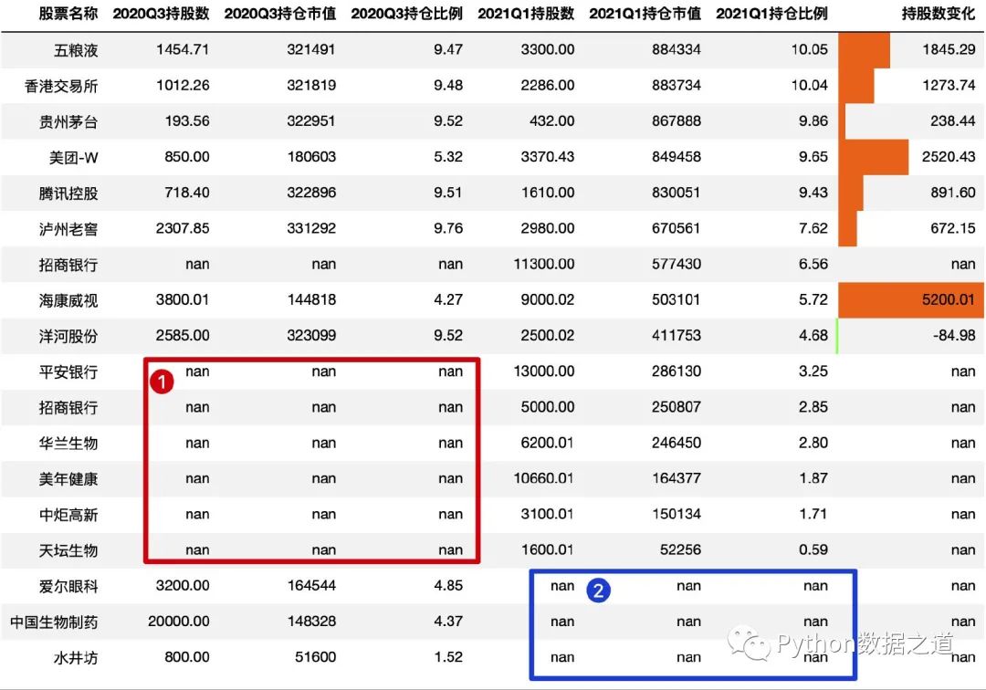 在上面的表格中,nan 数据结果,是由于数据披露的情况,有些数据咱们是获取不到的,因此也计算不了持仓增减情况,这些数据,在实际判断中,意义是不大的。