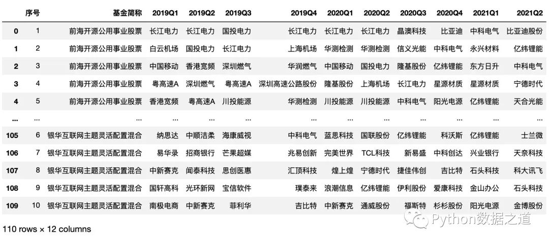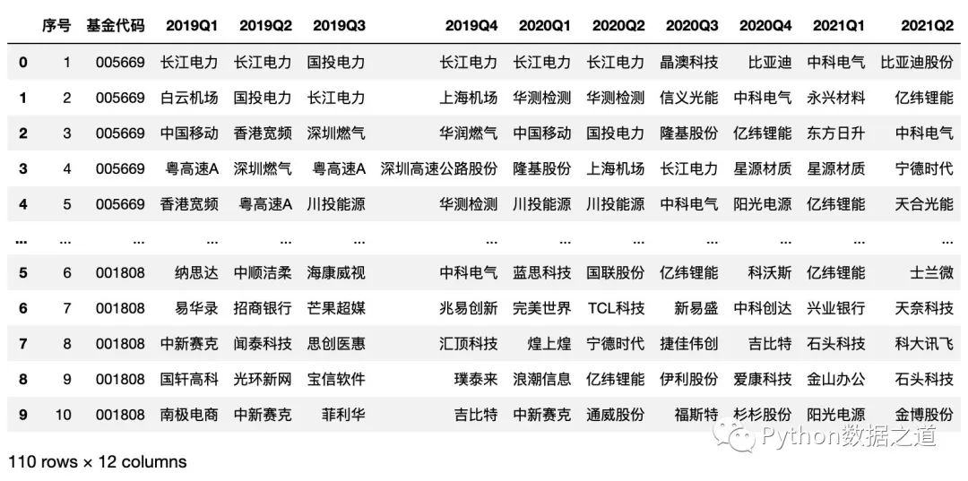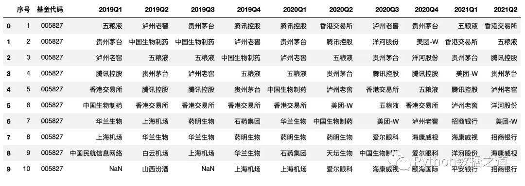 通过自定义函数 fund_stock_holding(years,code) 可以同时获取多只基金的十大持仓信息,代码如下: