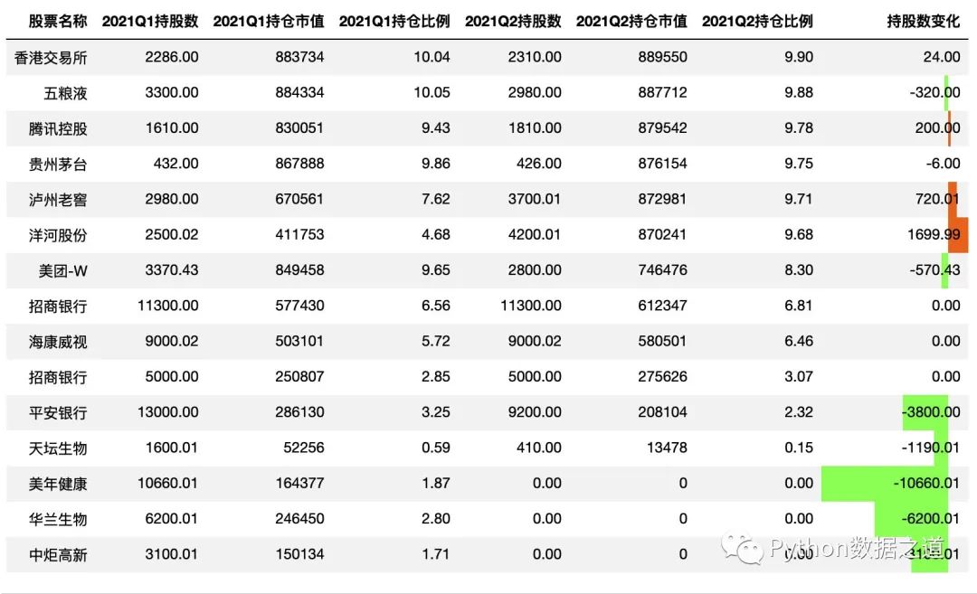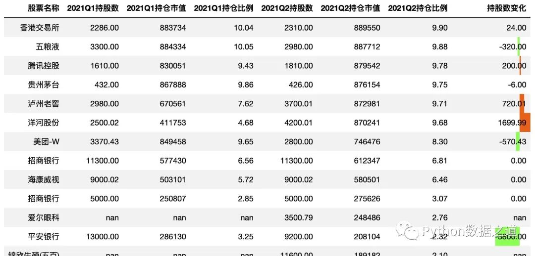 format_dict = {s1_share: '{0:.2f}', s2_share: '{0:.2f}', s1_value: '{0:.0f}', s2_value: '{0:.0f}',s1_ratio: '{0:.2f}', s2_ratio: '{0:.2f}', '持股数变化': '{0:.2f}'}df_merge.style.hide_index()\.hide_columns(['股票代码'])\.format(format_dict)\.bar(subset=['持股数变化'],color=['#99ff66','#ee7621'],align='mid')