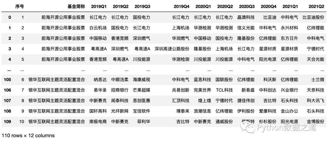 需要注意的是,由于Q2 和 Q4,即半年度和年度报告,是需要披露全部持仓的,因此在拼接后的dataframe 中,对应列的 NaN 数据应为 0,这一点可以细细品味下。