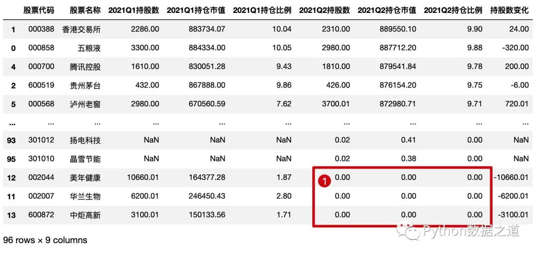 在获取了两个季度的数据后,将数据按 "股票代码" 进行拼接,在得到的 dataframe 中,可以对持股的增减情况进行判断。