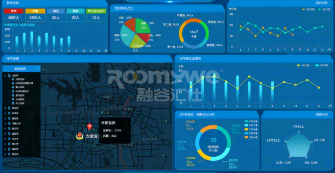 支持基于地理信息系统,对辖区内各监狱的数量、位置、规模进行可视化监测;支持综合集成监狱各管理系统数据,对各监狱警务装备、执勤警力、监管对象等管理要素的数量、类型、状态等详细信息进行实时监测;对犯罪类型、领域、人数等进行可视化分析,辅助用户综合掌控监狱运行态势。