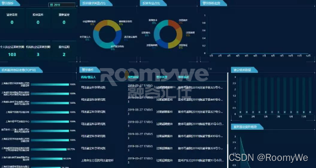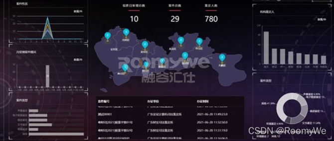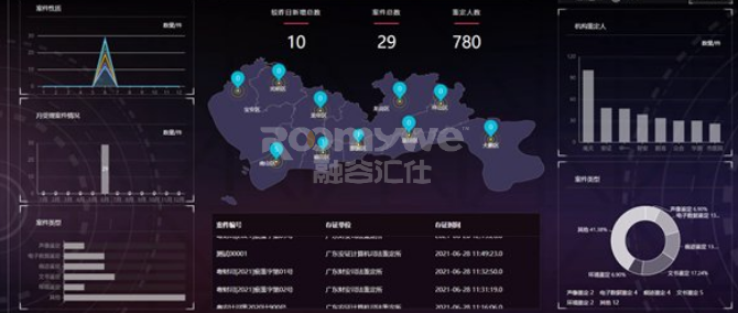 支持对接各级各类司法机构现有数据资源,提供统计图表、分布图、关系图、空间统计图、空间分布图、空间关系图等多大类近百种数据可视分析图表,进行多维度分析研判,并支持组合为数据分析驾驶舱进行综合显示,实现多指标数据的并行监测分析,为管理者决策研判提供全面的数据支持。