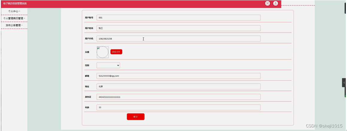 个人中心,在个人中心页面通过填写用户账号,用户姓名,用户手机,头像,性别,邮箱,地址,身份证,年龄等信息并提交进行个人信息修改操作,如图5-13所示。