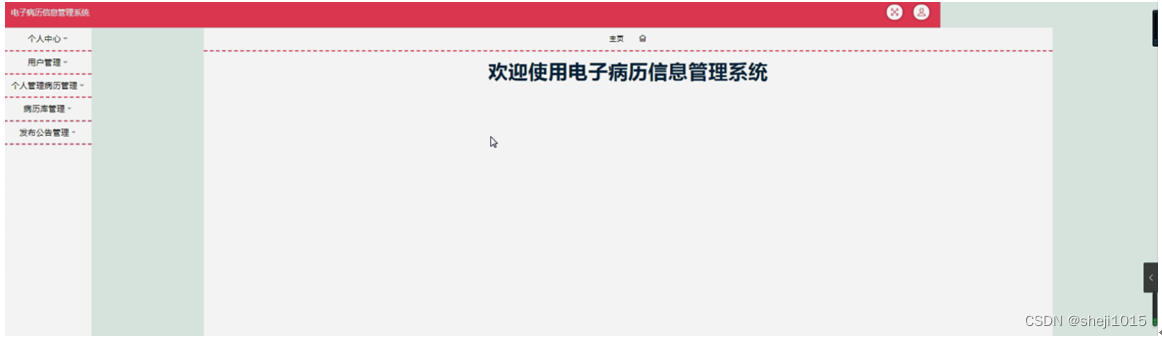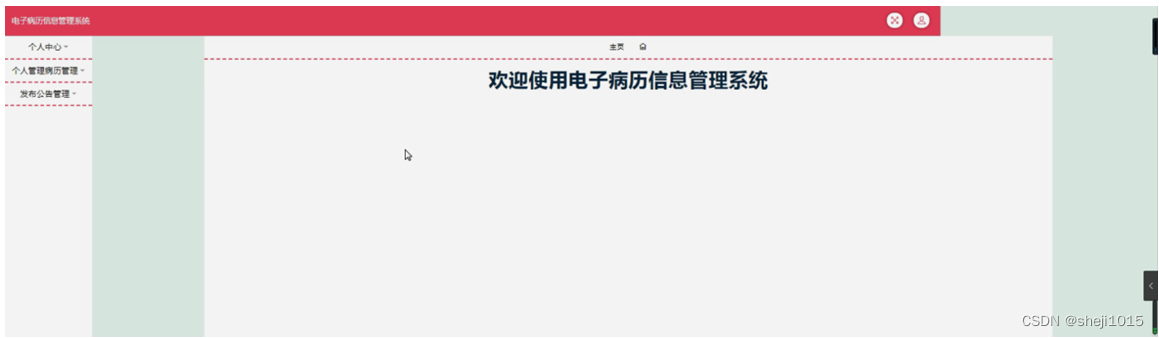 用户登录进入电子病历信息管理系统,可以对主页,个人中心,个人管理病历管理,发布公告管理等功能进行相应操作,如图5-12所示。