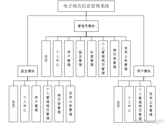 通过前面的功能分析可以将电子病历信息管理系统的功能分为管理员,医生和用户三个部分,系统的主要功能包括主页,个人中心,用户管理,医生管理,科室管理,个人管理病历管理,病历库管理,发布公告管理等内容。任何用户都要经过注册登录后才能进入系统进行操作,。