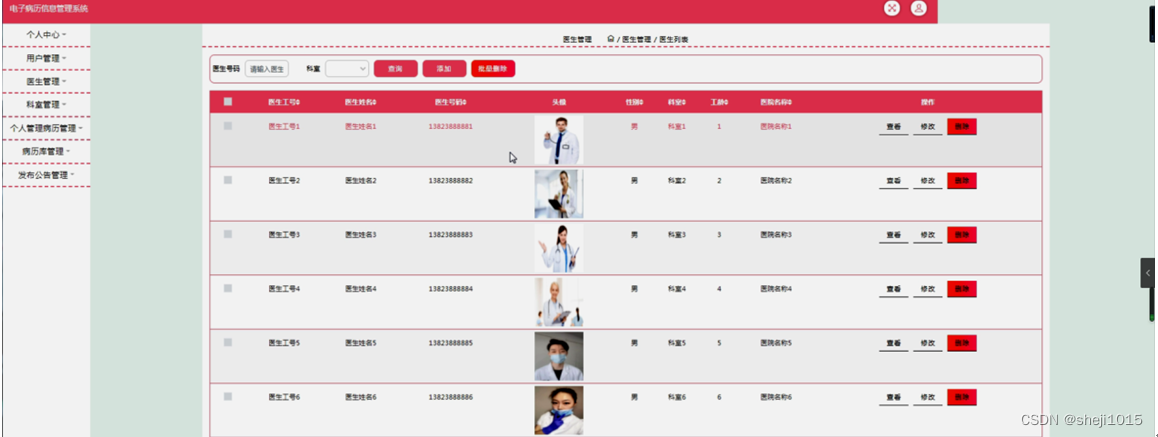 医生管理,在医生管理页面可以对医生工号,医生姓名,医生号码,头像,性别,科室,工龄,医院名称等信息进行查看,修改和删除等操作,如图5-4所示。