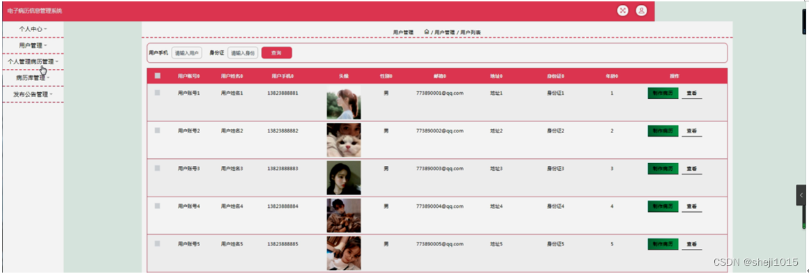 用户管理,在用户管理页面可以对用户账号,用户姓名,用户手机,头像,性别,邮箱,地址,身份证,年龄等内容进行制作病历或查看等操作,如图5-9所示。