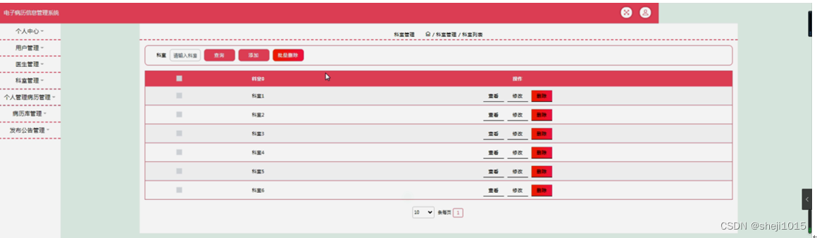 科室管理,在科室管理页面可以对科室信息进行查看,修改和删除等操作,如图5-5所示。