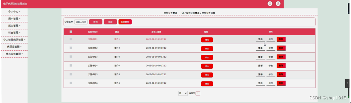 发布公告管理,在发布公告管理页面可以对公告名称,简介,发布日期,视频等内容进行查看,修改和删除等操作,如图5-6所示。