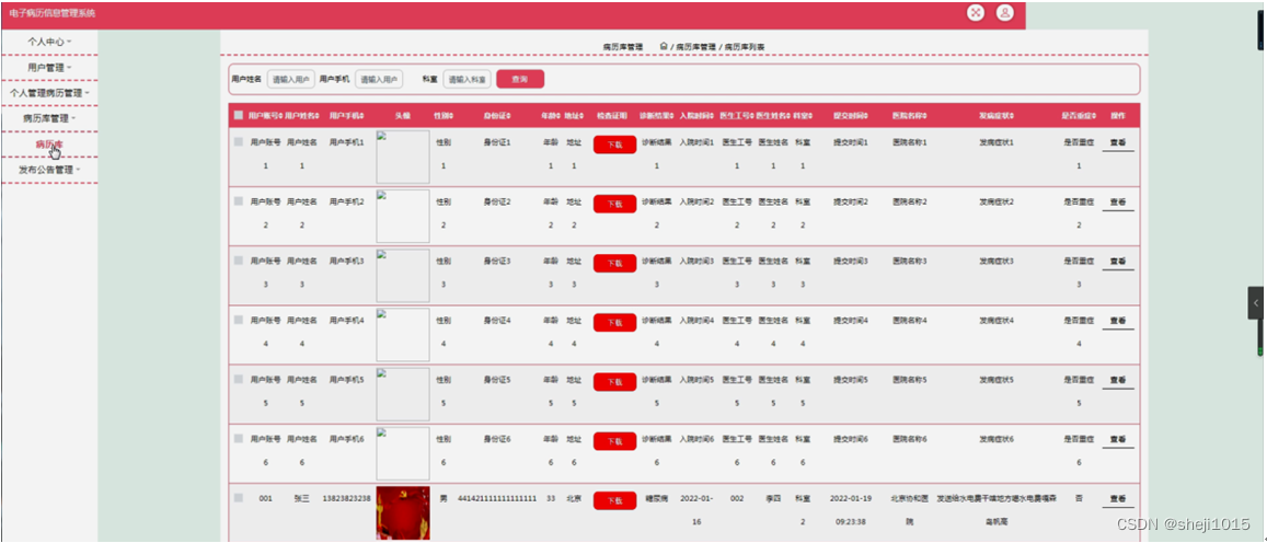 病历库管理,在病历库管理页面可以对用户账号,用户姓名,用户手机,头像,性别,身份证,年龄,地址,检查证明,诊断结果,入院时间,医生工号,医生姓名,科室,提交时间,医院名称,发病症状,是否重症等内容进行查看操作,如图5-11所示。