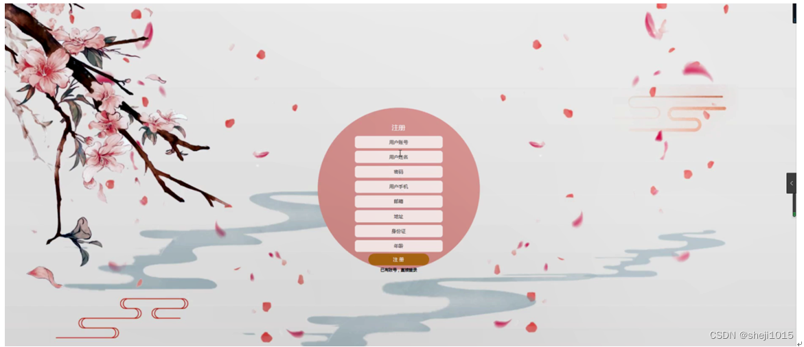 用户注册,在用户注册页面通过填写用户账号,用户姓名,密码,用户手机,邮箱,地址,身份证,年龄等信息完成用户注册,如图5-2所示。