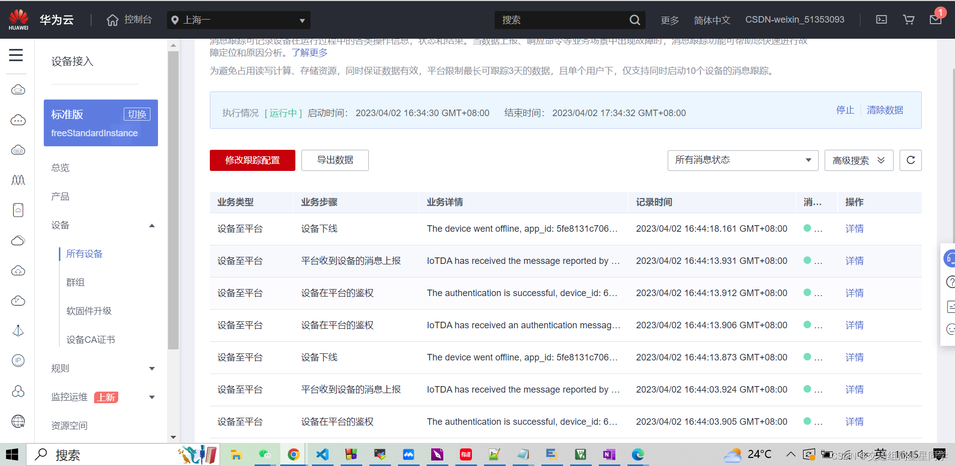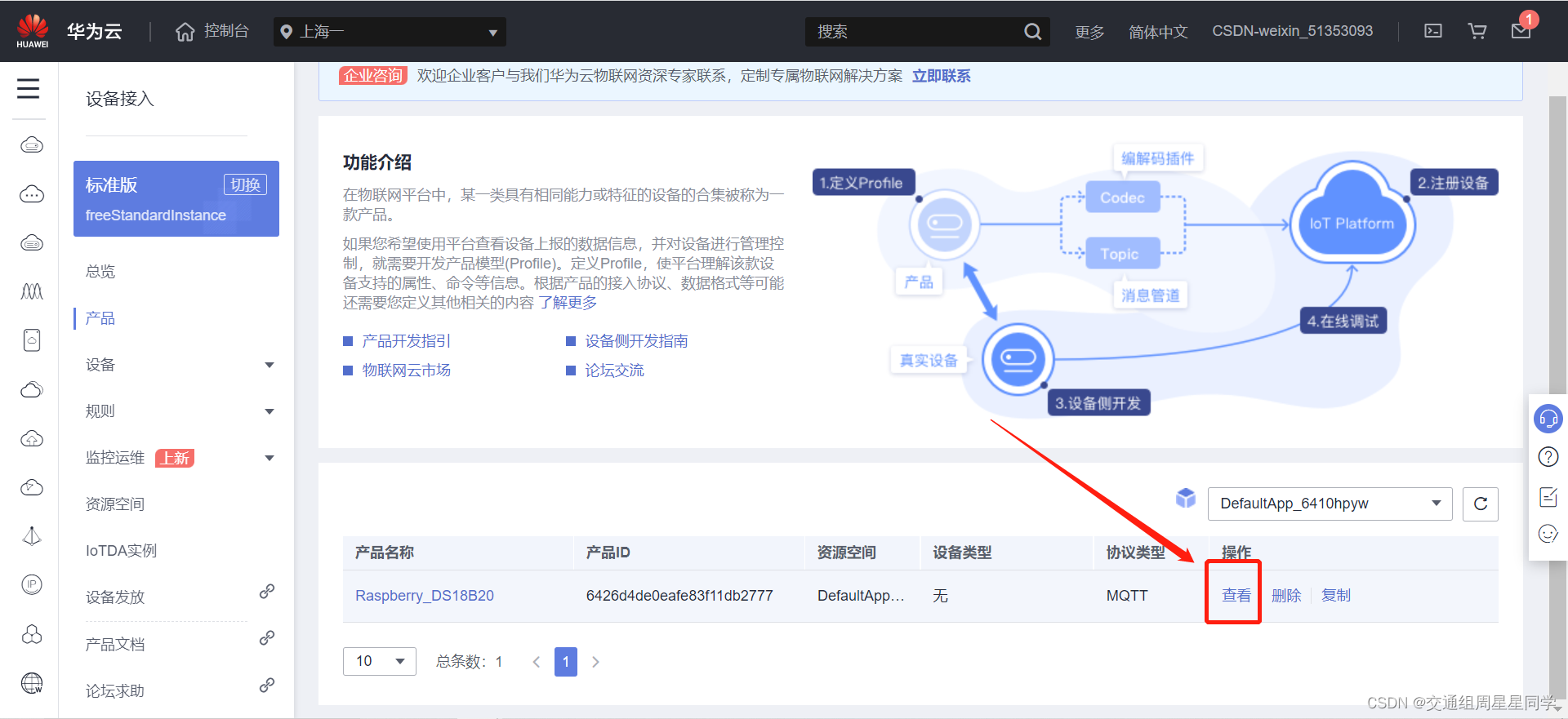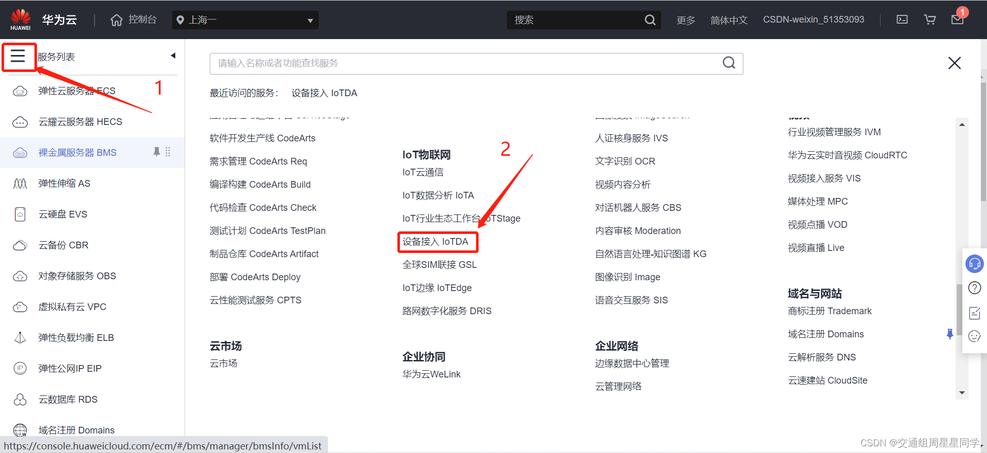 2、点击左上角的导航栏,在展开的页面找到“设备接入 IoTDA”