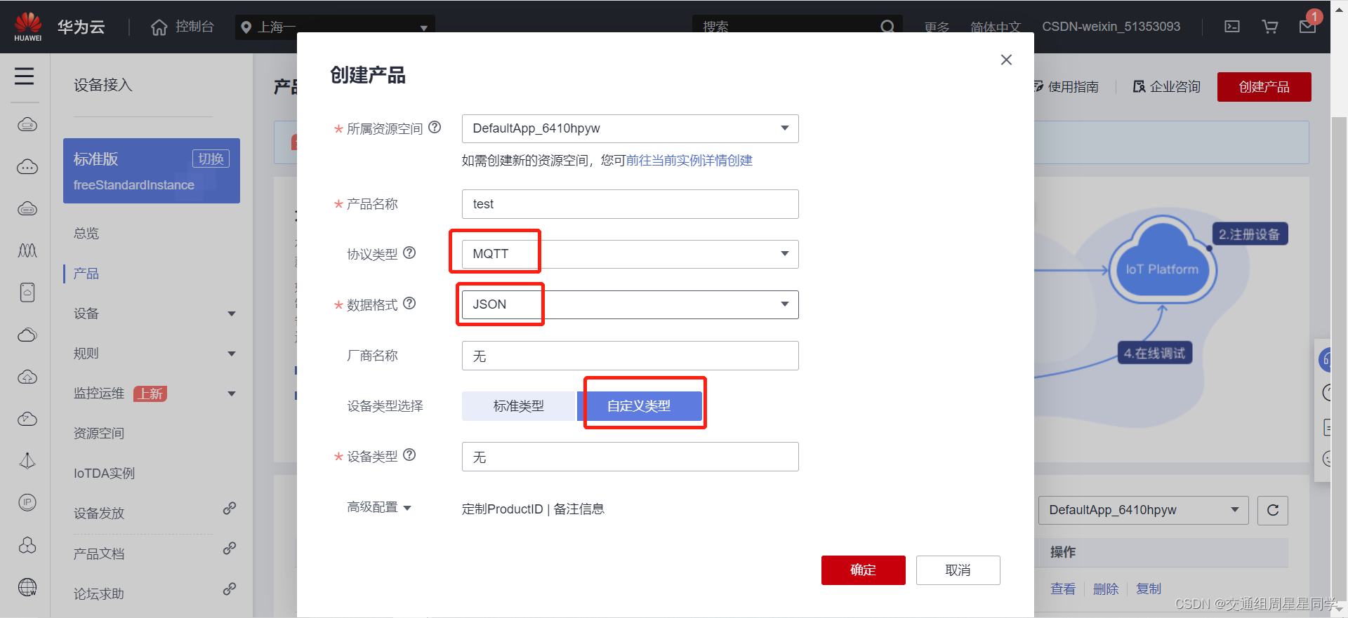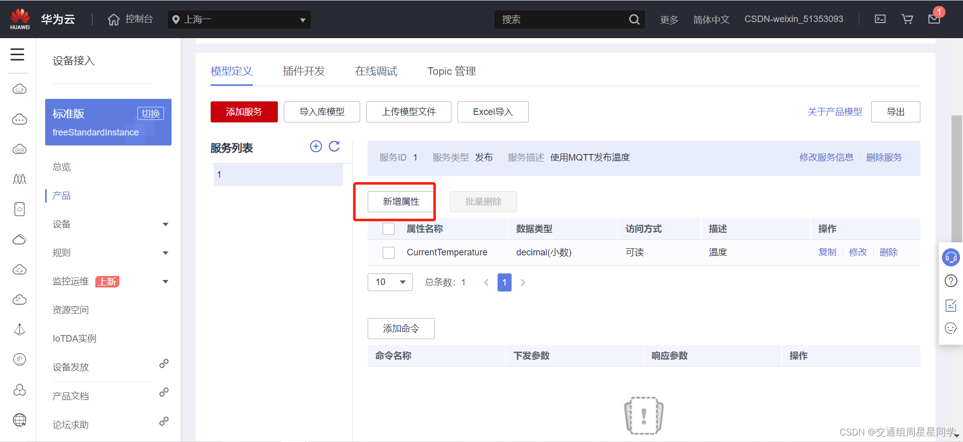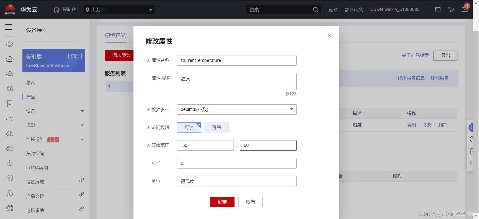 5、新增属性信息如下,点击确定,产品一个发布温度的功能就创建好了