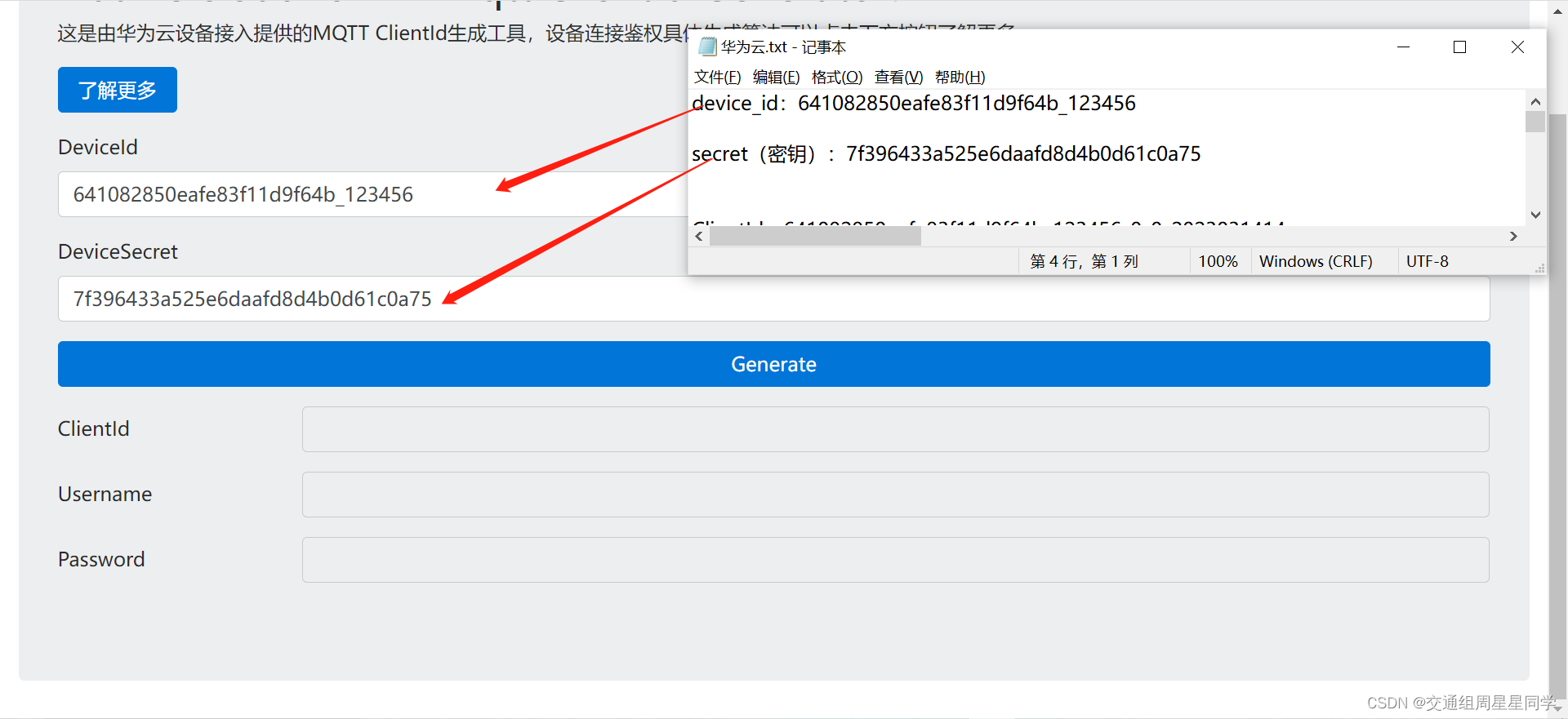 将前面保存的文件中的的 device_id 和 secret 填入后按“Generate”,并将生成的连接信息复制到txt文件中,方便后面使用和校正