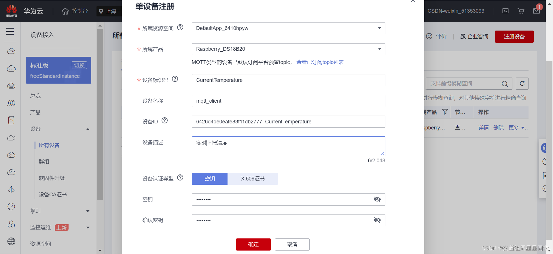 2、填写相关信息,设备就创建成功了