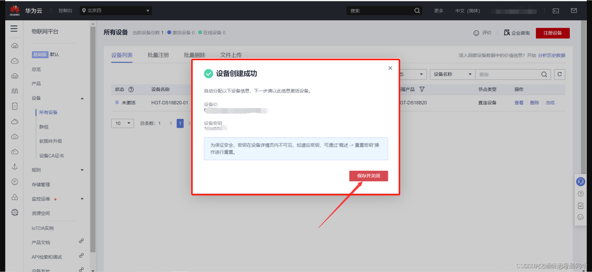 1、上一个步骤完成后会弹出下面的这个界面,我们点击保存并关闭,保存设备信息到txt文件中以便等会儿MQTT客户端连接华为云使用