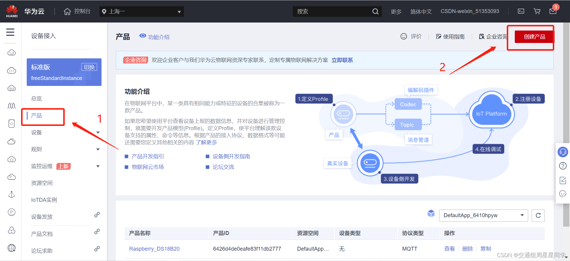 3、点击“产品” ,再点击“创建产品”