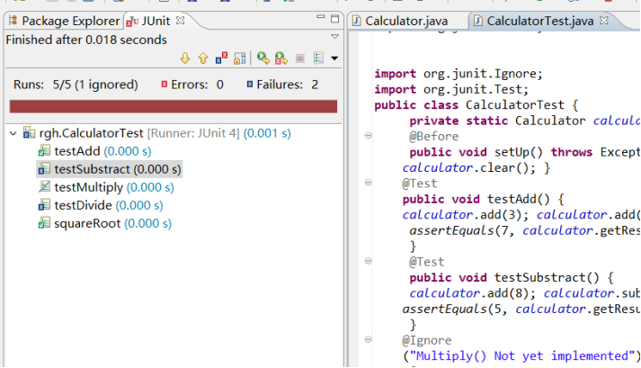 进度条是红颜色表示发现错误,具体的测试结果在进度条上面有表示“共进行了4个测试,其中1个测试被忽略,二个测试失败”。