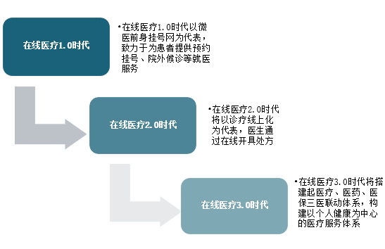 我国在线医疗跨越了以在线挂号为代表的1.0时代,目前正处于以在线医院为代表的2.0时代,未来将向三医联动为代表的3.0时代迈进。