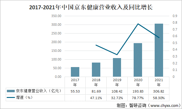 近年来,我国互联网企业医疗业务营收持续增长。2020年,京东健康营业总收入193.83亿元,较上年增加85.4亿元,同比增长78.77%;2021年,京东健康营业总收入306.82亿元,较上年增加113.00亿元,同比增长58.3%。