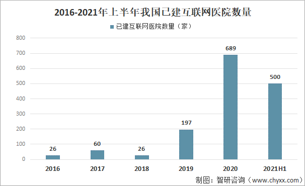 近年来,我国互联网医院发展迅速。截至2021年6月,我国互联网医院总数已超1600家,其中仅2021年上半年新增的互联网医院就有500家。