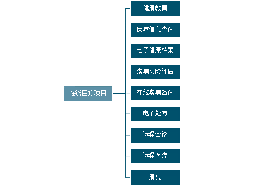 在线医疗是在线在医疗领域的新应用,按照覆盖“面”的特点,可被划分到医疗信息化发展过程中的数据整合阶段。在线医疗包含健康教育、医疗信息查询、电子健康档案、疾病风险评估、在线疾病咨询、电子处方、远程会诊、远程医疗和康复等多种项目。