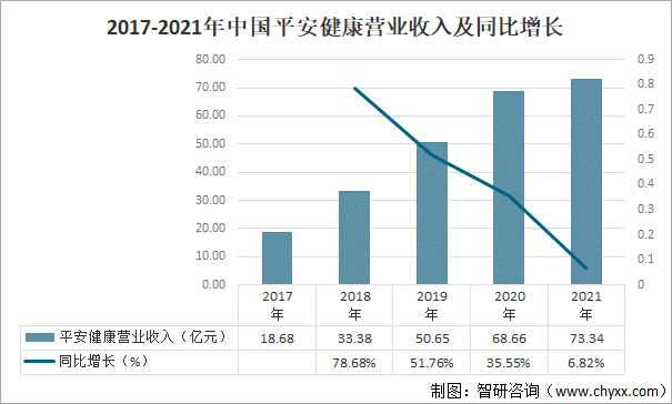 2020年,平安健康营业总收入68.66亿元,较上年增加18.01亿元,同比增长35.55%;2021年,平安健康营业总收入73.34亿元,较上年增加4.68亿元,同比增长6.82%。