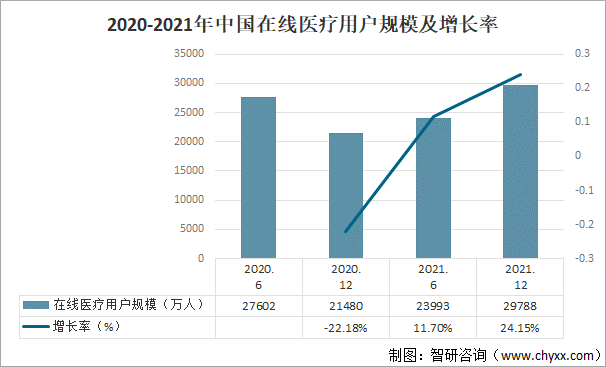 2021年,在线医疗行业持续保持高速发展。在人工智能等前沿技术的支持下,病毒追踪、药物研发等取得重大突破。截至2021年12月,我国在线医疗用户规模达2.98亿,较2020年12月增长8308万,占网民整体的28.9%。