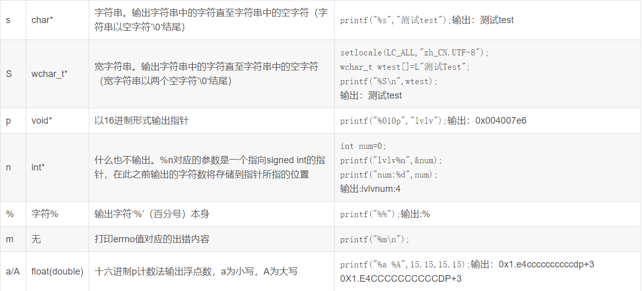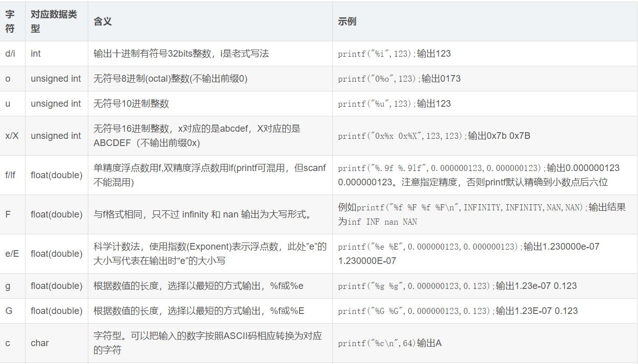 关于printf函数的使用方法可以参考下面的表格:
