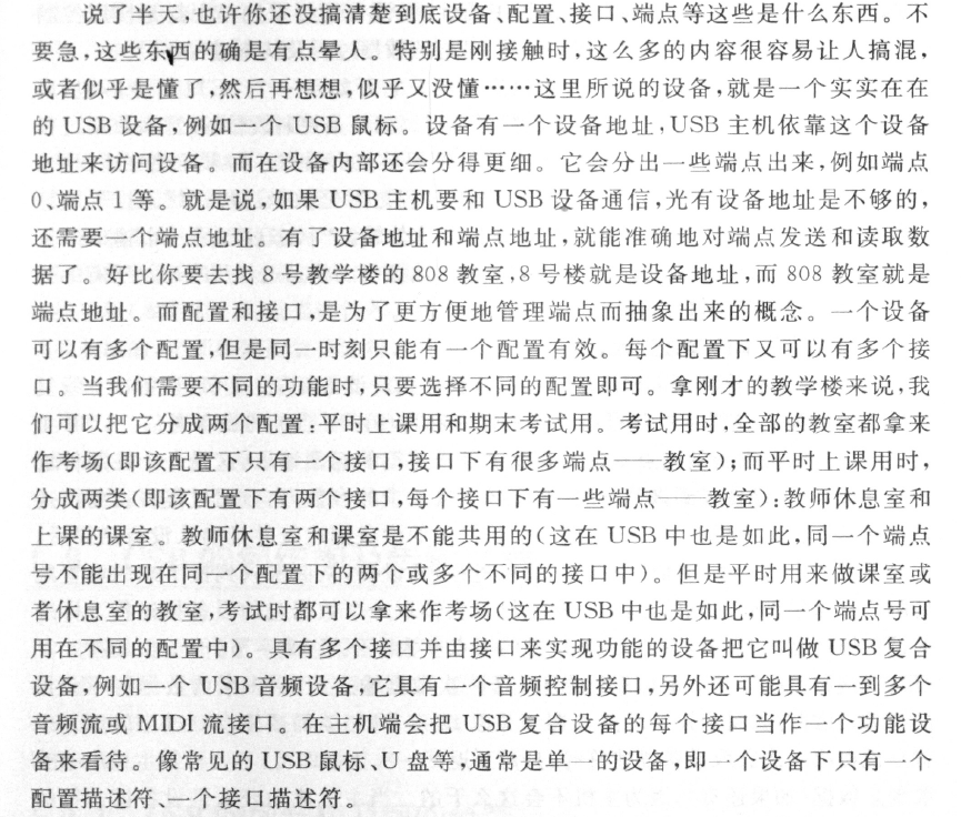 这里自己的理解是:一个设备只有一个设备号,有若干端点,在一个配置中,不同接口的端点号不同,端点号是唯一的,就像是例子中的教室,可能在不同配置中,同一个端点属于了不同的接口,就像是一个教室,在不同的配置中可以是教室也可以是考场。但是其端点号不可改变。