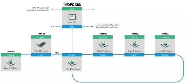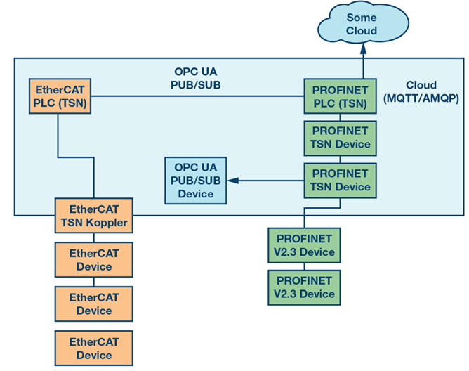 图4 TSN段与PROFINET和EtherCAT结合使用。