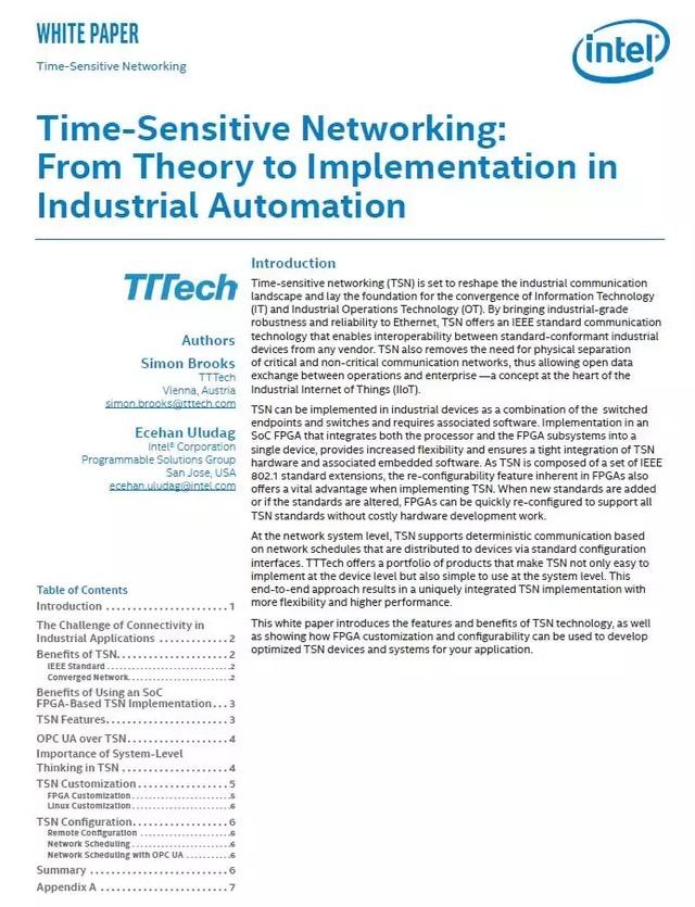 2017年11月,英特尔公司和TTTech宣布合作开发基于FPGA的TSN解决方案,该解决方案将TTTech的TSN以太网IP与英特尔SoC FPGA平台相结合。2018年10月TTTech和英特尔联合发表了一份白皮书,为寻求在工业自动化系统中实现TSN网络技术的客户提供指导。白皮书概述了所有的TSN标准、优点和特点,并描述了TTTech和英特尔今天可用的产品如何用于开发优化的TSN设备和系统。