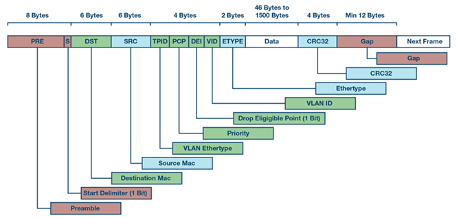 图1 在此以太网帧中,与TSN数据流识别相关的数据字段以绿色显示