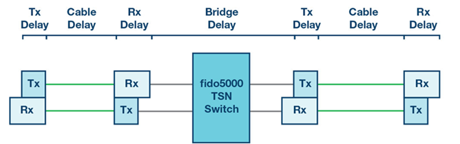 图3 PHY,电缆和交换机导致数据传输延迟。必须使用时隙方法(PROFINET IRT和TSN时间感知整形器(TAS))来考虑这一点。