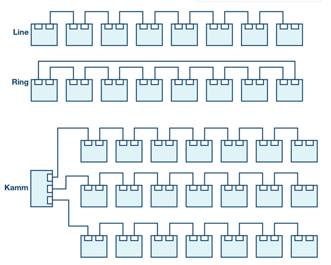 交换机级联从一开始就对工业环境构成了挑战。除了IT领域中使用的星形拓扑外,线路,环形和树形拓扑结构也经常用于自动化(图2)。这些改进的拓扑结构显著降低了以太网安装布线要求和成本。因此,在工业中,通常将采用直通策略的双端口交换机集成到现场设备中。直通意味着数据报在完全接收之前就被转发,从而大大提高了转发效率。