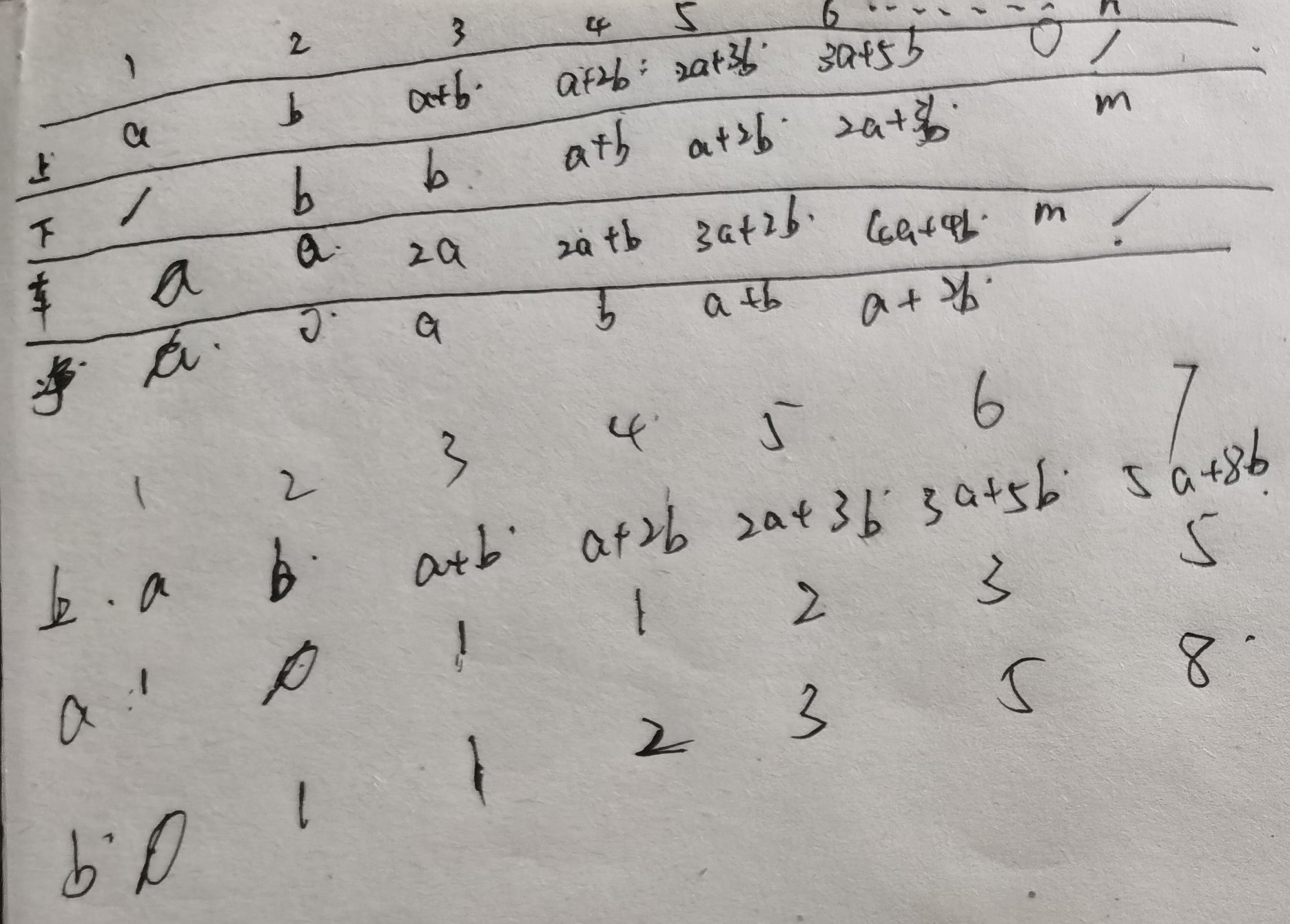 火车从始发站(称为第 11 站)开出,在始发站上车的人数为 aa,然后到达第 22 站,在第 22 站有人上、下车,但上、下车的人数相同,因此在第 22 站开出时(即在到达第 33 站之前)车上的人数保持为 aa 人。从第 33 站起(包括第 33 站)上、下车的人数有一定规律:上车的人数都是前两站上车人数之和,而下车人数等于上一站上车人数,一直到终点站的前一站(第 (n-1)(n−1) 站),都满足此规律。现给出的条件是:共有 nn 个车站,始发站上车的人数为 aa ,最后一站下车的人数是 mm(全部下车)。试问 xx 站开出时车上的人数是多少?