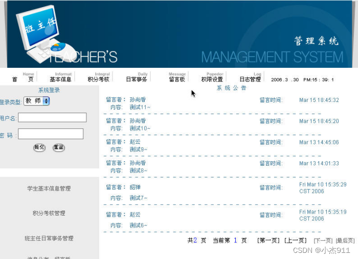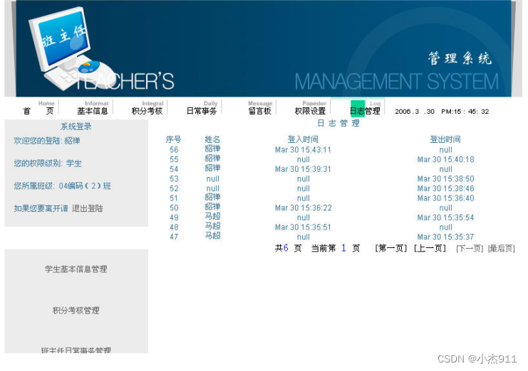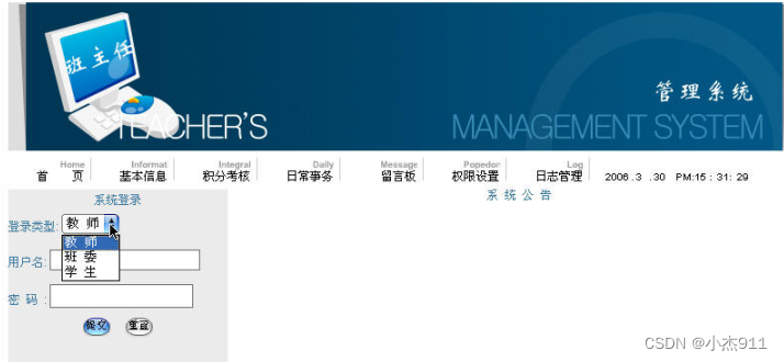 登入系统过程后所产生的系统显示也有所不同,按照默认系统登入类别分为:教师,班委,学生3种类型。相应的登陆信息图1 图2图3 见图2-5 2-6 2-7