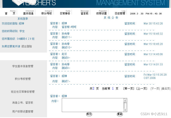 班委:对班级成员千分制的录入;对班级千分制的查询;留言板上留言。