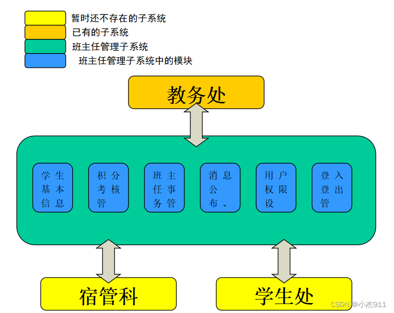 说明:班主任管理子系统和教务处、宿管科、学生处都有数据交互。