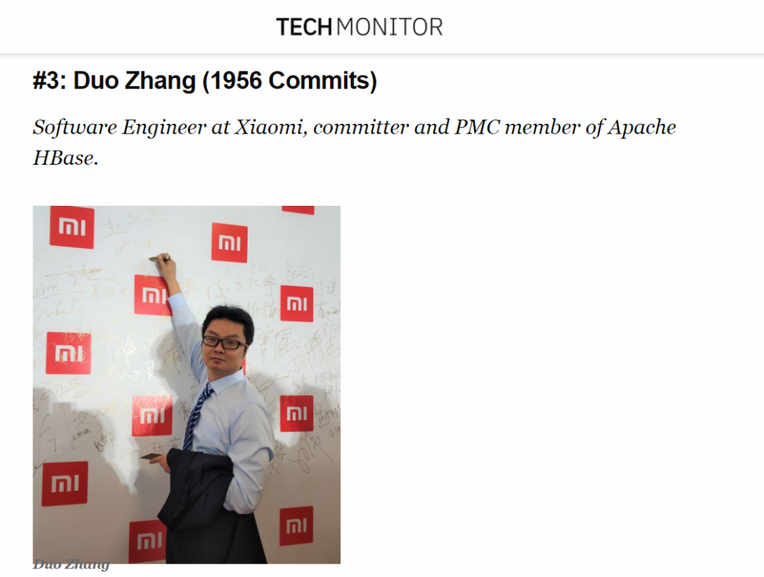 从第一次提交 Patch 到成为 Apache HBase 项目的 Committer,到成为 PMC 成员,再到成为项目主席,张铎花了 4 年左右的时间。在这期间,张铎离开豌豆荚加入了小米,当初鼓励他提交 Patch 的冯宏华则成了他的直属领导。在逐步深入参与 HBase 开源社区的同时,张铎也成为了奠定小米在开源领域和 Apache HBase 江湖地位的核心人物之一,后来他又担任小米开源委员会主席,总体负责小米开源工作的规划与推进。