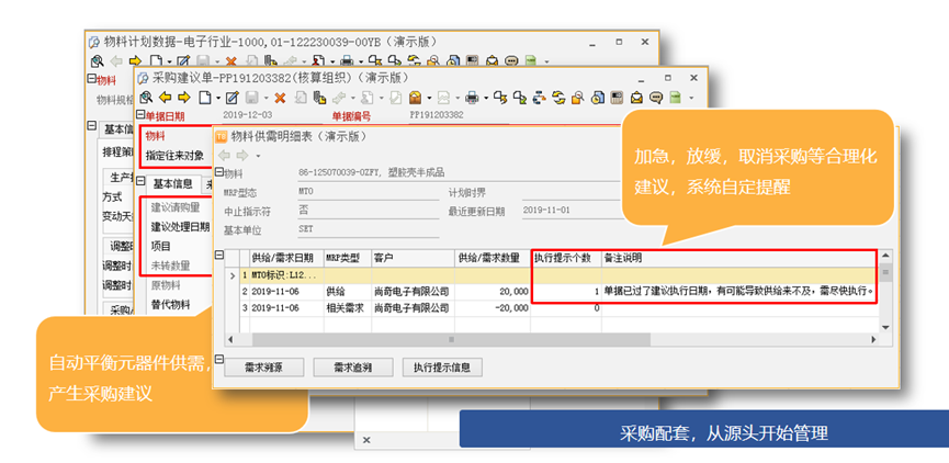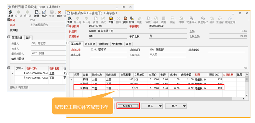 ERP系统物料提供齐套采购设定,配套校正自动补齐配套下单,可以避免因领料管理不当,出现品质隐患造成直接退货损失的风险。