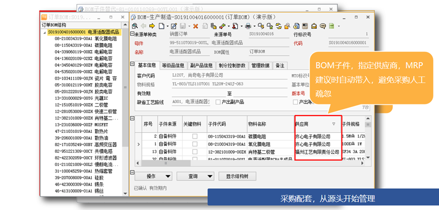 BOM子件,指定供应商,MRP建议时自动带入,避免采购人工疏忽。