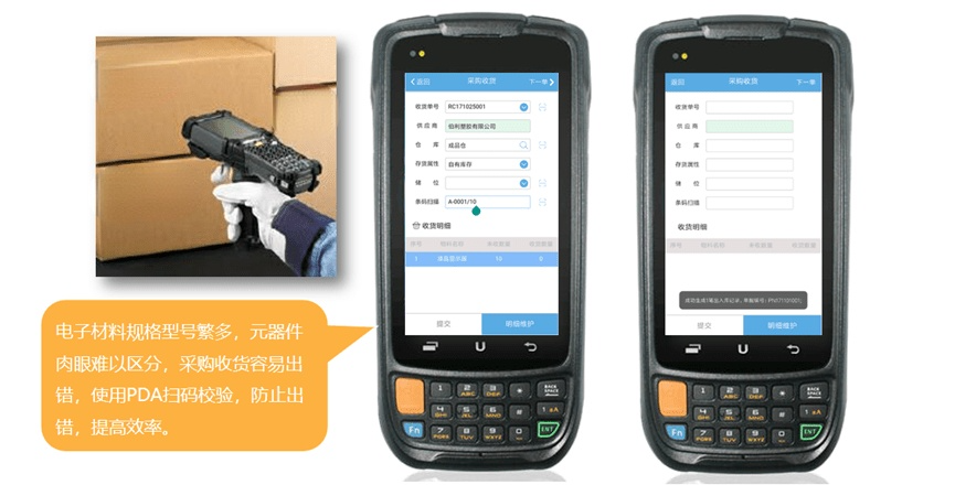电子材料规格型号繁多,电子元器件肉眼难以区分,采购收货容易出错,使用正航PDA扫码校验,防止出错,提高效率。